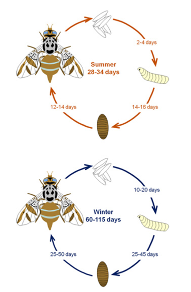 The Medfly life cycle varies with temperature, taking up to 115 days in winter and 30 days in summer to complete a life cycle. This is how the species survives in temperate climates through cooler winters when food may be scarce. In warm areas (minimums above 12⁰C) Medfly can also survive winter as an adult.