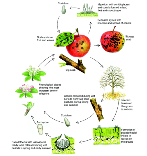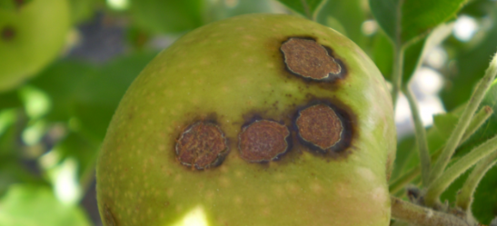While leaves gain some resistance roughly 16 days after emergence, fruit remain susceptible right up to harvest. Later season infections may be subtle taking 9 days for the visual lesions to appear at the optimal weather conditions and are often missed during picking, only to develop later as storage scab.