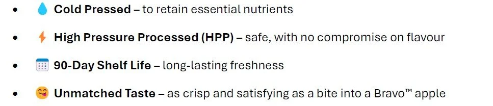 Soluna™ Apple Juice is crafted using cutting-edge cold-pressing technology, ensuring maximum nutrient retention and fresh flavour in every bottle. To maintain both safety and quality without the use of heat, the juice undergoes High-Pressure Processing (HPP), a method that preserves the natural integrity of the juice.